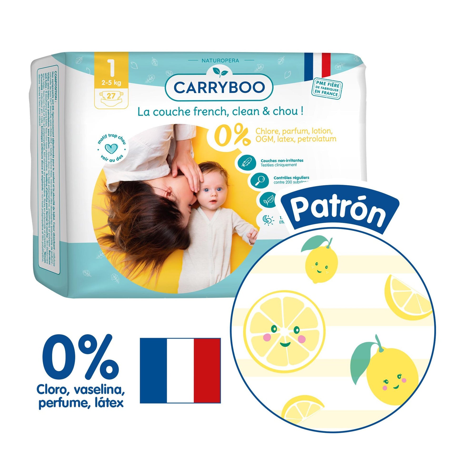 Carryboo-Windeln der Größe 1, empfohlen für Neugeborene oder Babys mit einem Gewicht zwischen 2 und 5 kg.