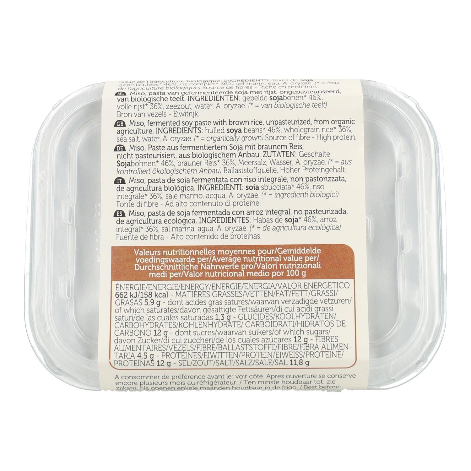 Zutaten: Sojabohnen* 46%, brauner Reis* 36%, Meersalz, Wasser, A. oryzae.* aus biologischem Anbau.