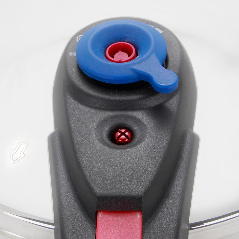 - Fünf Sicherheitssysteme: manuelle Griffverriegelung, Drucksensor mit automatischer Deckelverriegelung, Arbeitsventil, Sicherheitsventil und Seitenfenster.