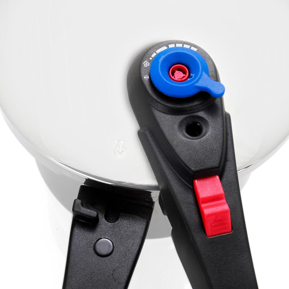 Es verfügt über ein Scherengriff-Öffnungssystem, das das Abdichten erleichtert, sowie über fünf Sicherheitssysteme: manuelle Griffverriegelung, Drucksensor mit automatischer Deckelverriegelung, Arbeitsventil, Sicherheitsventil und Seitenfenster.