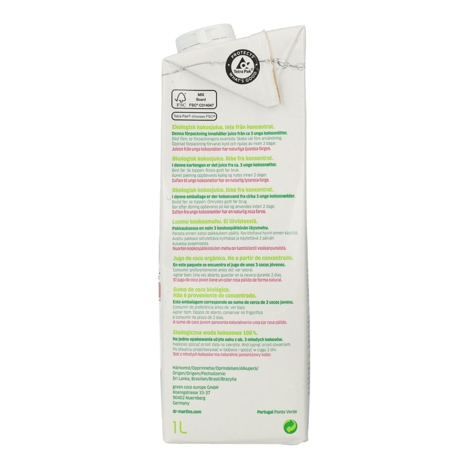 - 100% junges Kokoswasser (NFC) aus zertifiziertem Bio-Anbau.