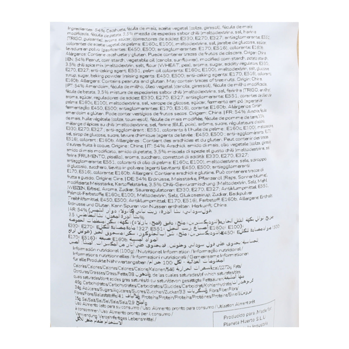 Ingredients: 54% peanut, cornstarch, vegetable oil (rapeseed, sunflower), modified corn starch, potato starch, 3.5% spicy chilli flavour mix (maltodextrin, salt, flour (wheat, pea), seasoning, sugar, acidity regulators: E330, E270, E327; anti-caking agent: E551, vegetable oil (palm) colouring agents: E160c, E100), maltodextrin, salt, glucose syrup, sugar, baking powder (raising agents: E450, E500; anti-caking agents: E170, E516), colouring agent: E160b.