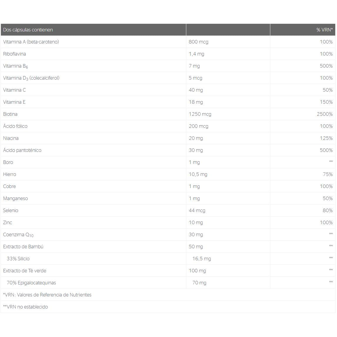 Grüntee-Extrakt (Camellia sinensis), Überzugsmittel (Hydroxypropylmethylcellulose), Zinkpicolinat, Eisen(II)-citrat, Bambusextrakt (Bambusa vulgaris), L-Ascorbinsäure, Calcium-D-Pantothenat, Coenzym Q-10 (Kaneka Q10), Füllstoff (mikrokristalline Cellulose), D-alpha-Tocopherylsäuresuccinat, Nicotinamid, Beta-Carotin, Pyridoxinhydrochlorid, L-Selenomethionin, Kupfercitrat, Natriumborat, Mangancitrat, Cholecalciferol, Riboflavin, D-Biotin, Calcium-L-Methylfolat (Metafolin®).