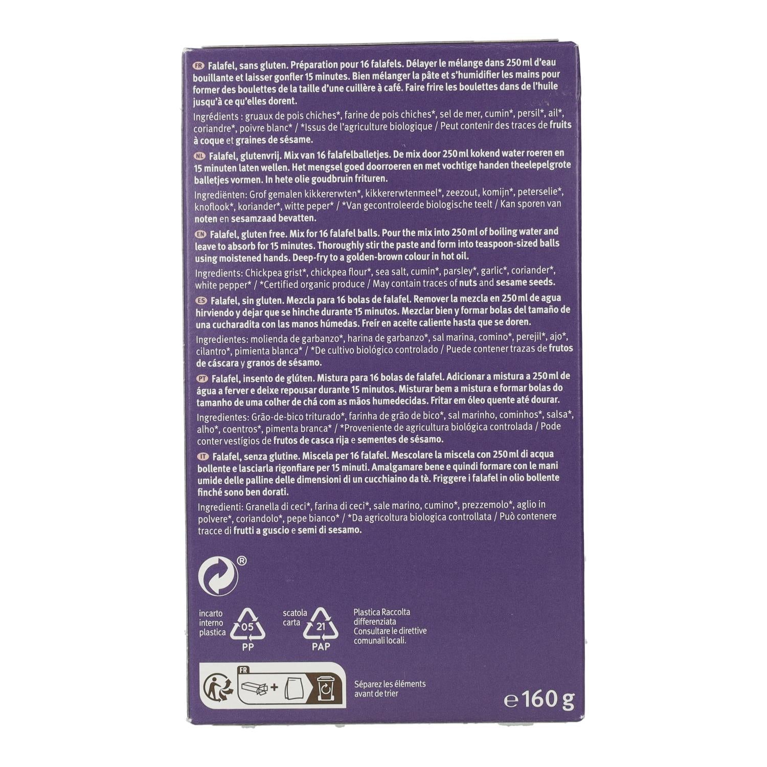 Ideal für die Zubereitung von Falafel , den Kichererbsenkroketten der arabischen Küche. Hergestellt aus hochwertigen Bio-Zutaten, glutenfrei.