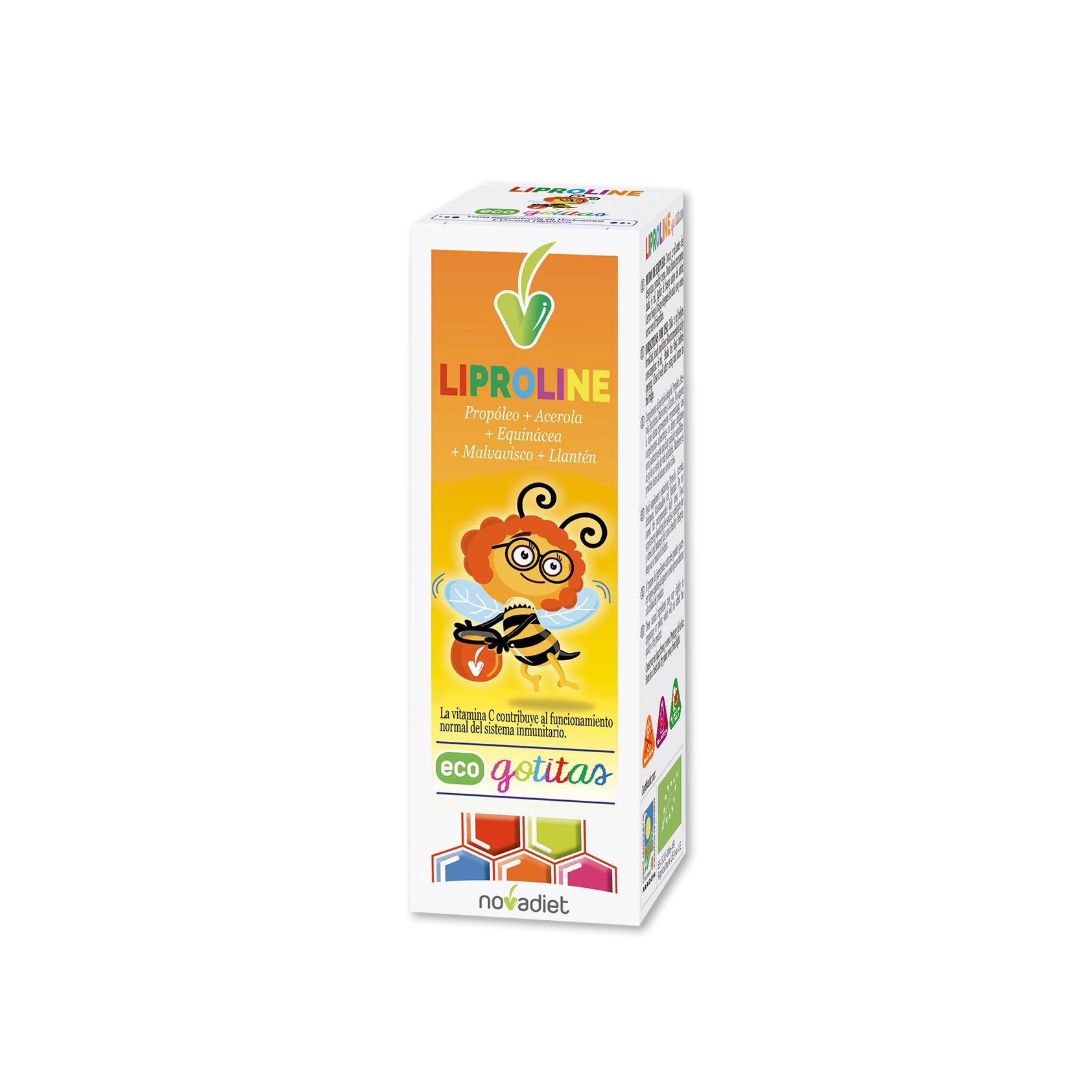 Novadiet Liproline Eco Drops ist ein natürliches und biologisches Nahrungsergänzungsmittel zur Stärkung des Immunsystems von Kindern ab 1 Jahr. Die Formel kombiniert Propolis mit Pflanzen wie Echinacea, Eibisch und Wegerich sowie Vitamin C aus Acerola, um die Symptome von Erkältungen und Grippe zu lindern und Halsschmerzen und Husten zu reduzieren.