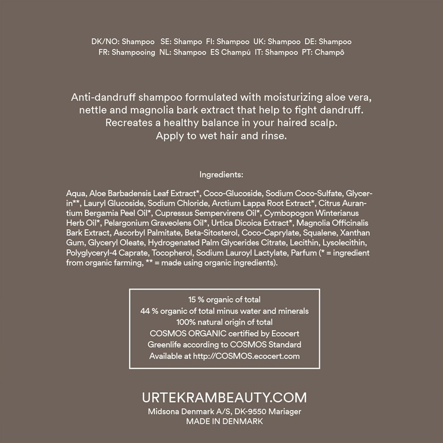 Aqua, Aloe Barbadensis Blattextrakt*, Natriumcocosulfat, Glycerin**, Coco-Glucosid, Laurylglucosid, Glyceryloleat, Natriumchlorid, Brennnesselextrakt*, Klettenlabkrautextrakt*, Geranienöl*, Zypressenöl*, Bergamotteöl*, Nardenöl*, Natriumlauroylactylat, Parfum, Polyglyceryl-4-Caprat, Xanthangummi, Lysolecithin, Zitronensäure, Coco-Caprylat, Tocopherol, Beta-Sitosterol, Squalen, Magnolienrindenextrakt, Geranie L. (* = Zutat aus biologischem Anbau, ** = Hergestellt mit biologischen Zutaten).