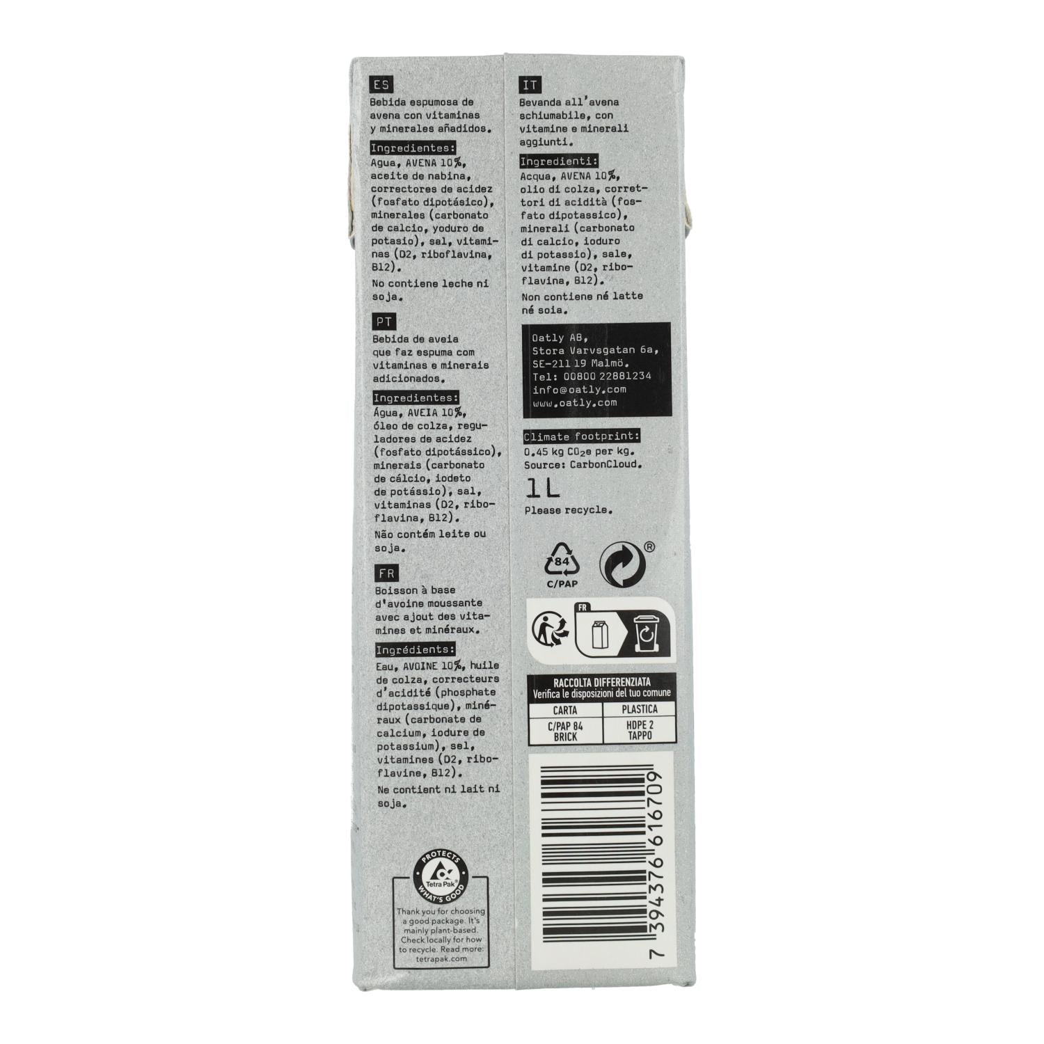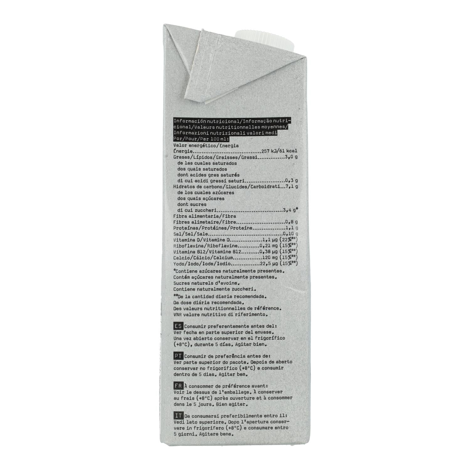 Zutaten : Haferbasis (Wasser, Hafer 10%), Rapsöl, Säureregulator (Dikaliumphosphat), Calciumcarbonat, Calciumphosphate, jodiertes Salz, Vitamine (D2, Riboflavin, B12)