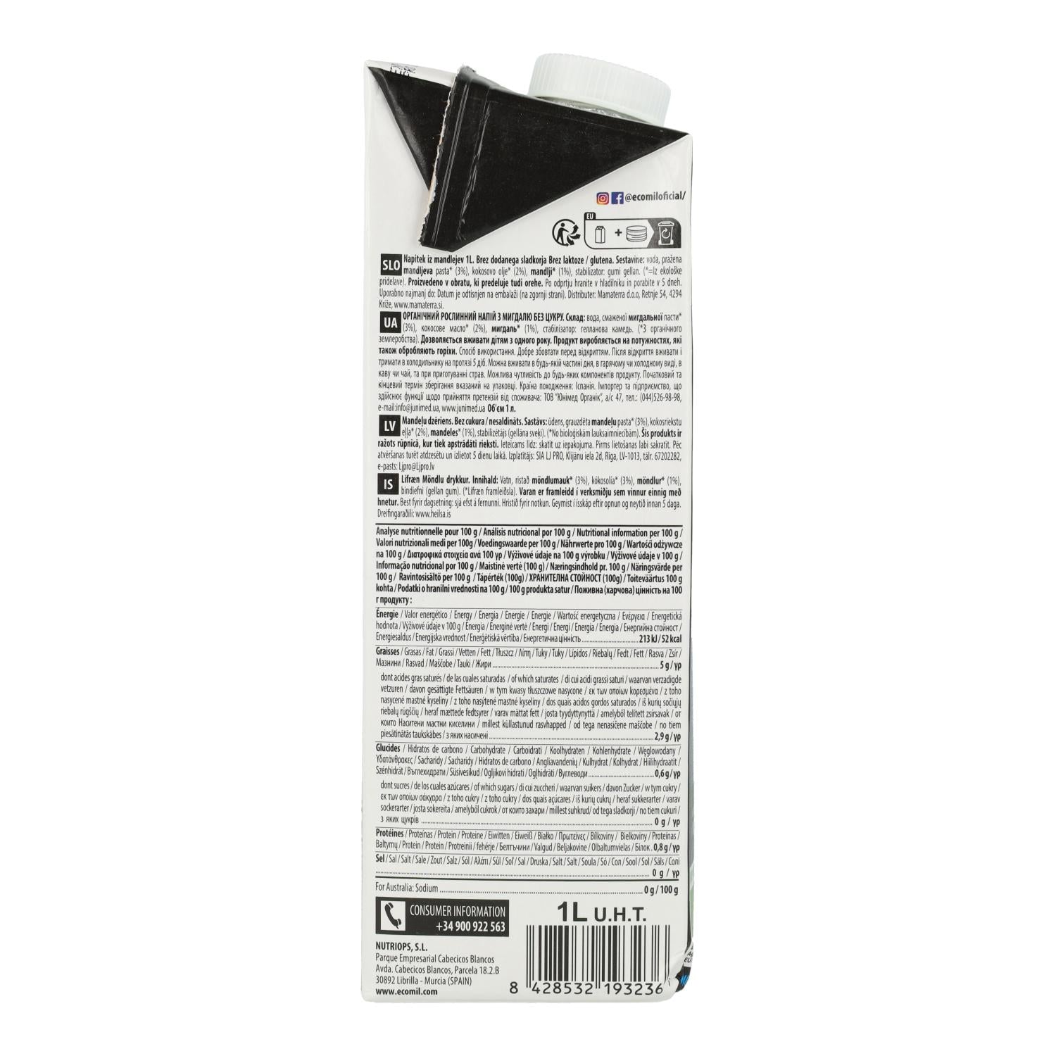 Zutaten: Wasser, geröstete Mandelpaste* (3 %), Kokosöl* (3 %), Mandeln* (1 %), Stabilisator: Gellangummi. Dieses Produkt wird in einem Betrieb hergestellt, der auch andere Nüsse verarbeitet. *Zutaten aus kontrolliert biologischem Anbau.