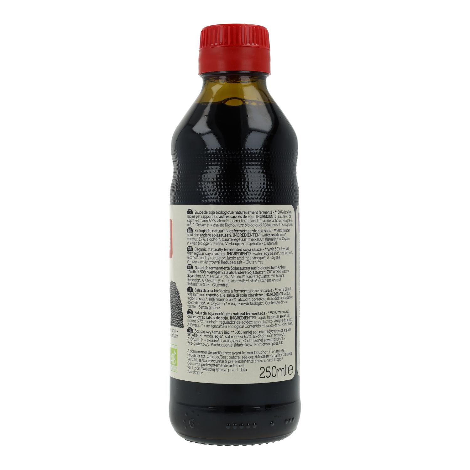 Zutaten: Wasser, Sojabohnen*, Meersalz 6,7 %, Alkohol*, Säureregulator: Milchsäure, Reisessig*, A. oryzae. *aus biologischem Anbau