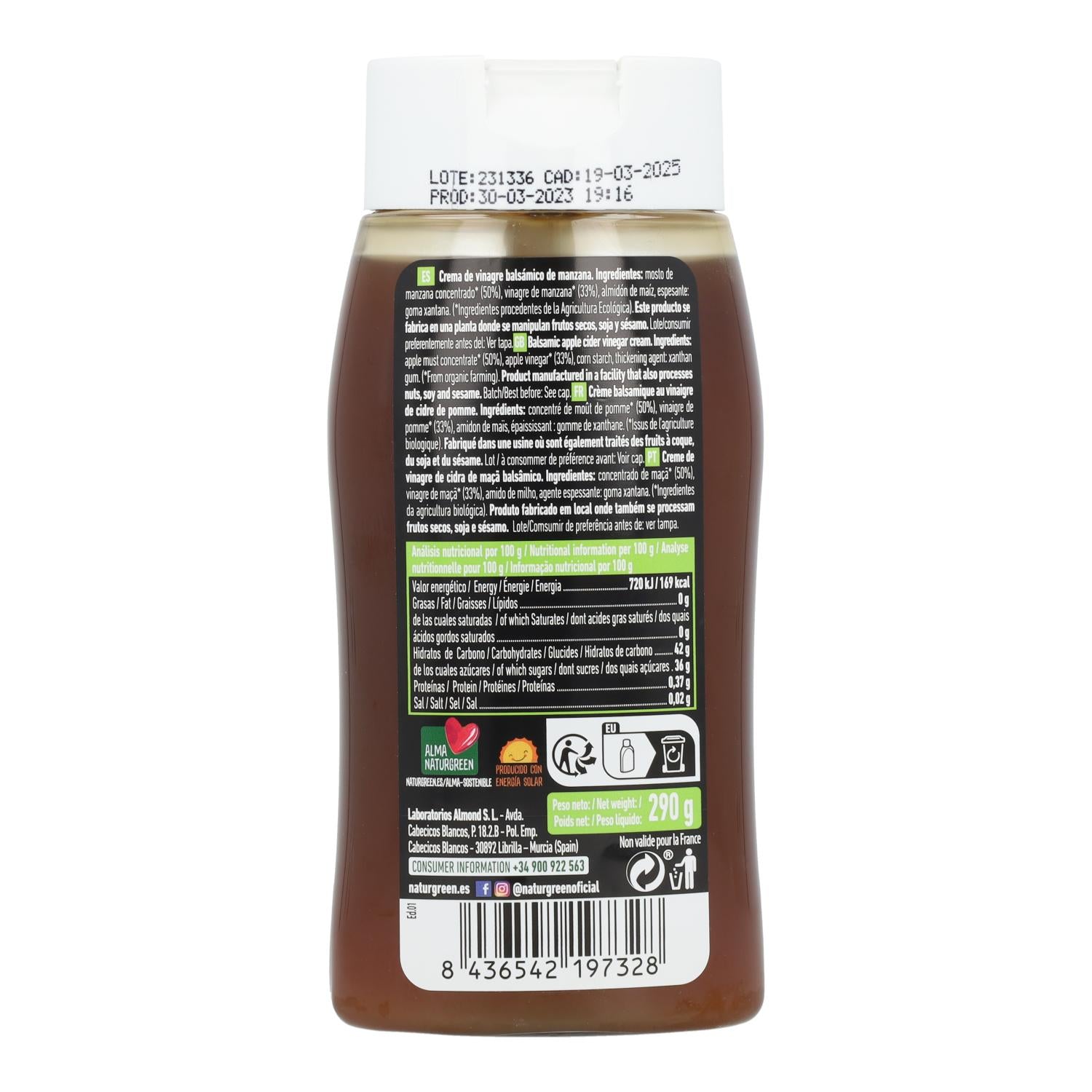 NaturGreen Bio-Apfelessig-Balsamico ist ein Bio-Produkt aus konzentriertem Apfelessig, der zu einer cremigen, dickflüssigen Konsistenz eingekocht wird. Glutenfrei und mit einem ausgewogenen süß-säuerlichen Geschmack eignet er sich perfekt zum Verfeinern von Salaten, Gemüse, Fleisch und Gourmetgerichten und verleiht ihnen eine elegante Note.