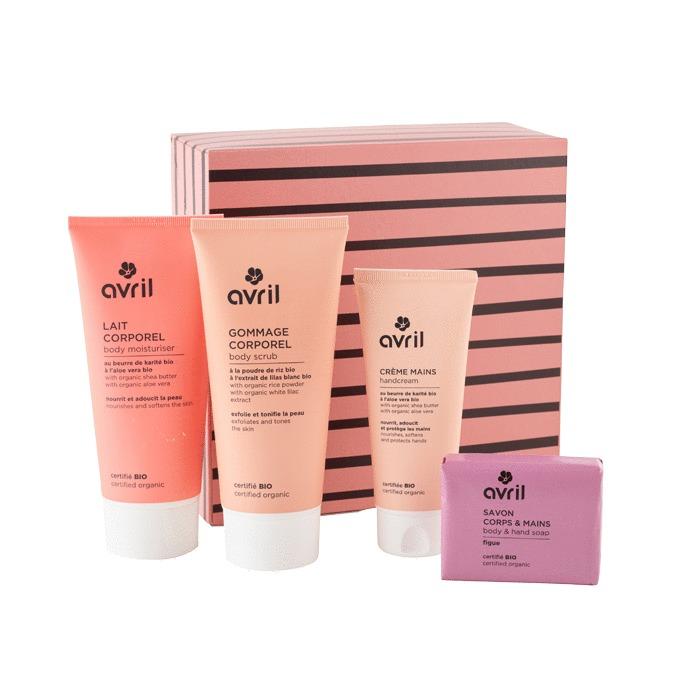 Hier ist eine Geschenkbox mit einer Auswahl an Körperpflegeprodukten: ein Körperpeeling, eine Körperlotion, eine Handcreme, eine Feigen-Körper- und Handseife in einer recycelten Kartonverpackung.