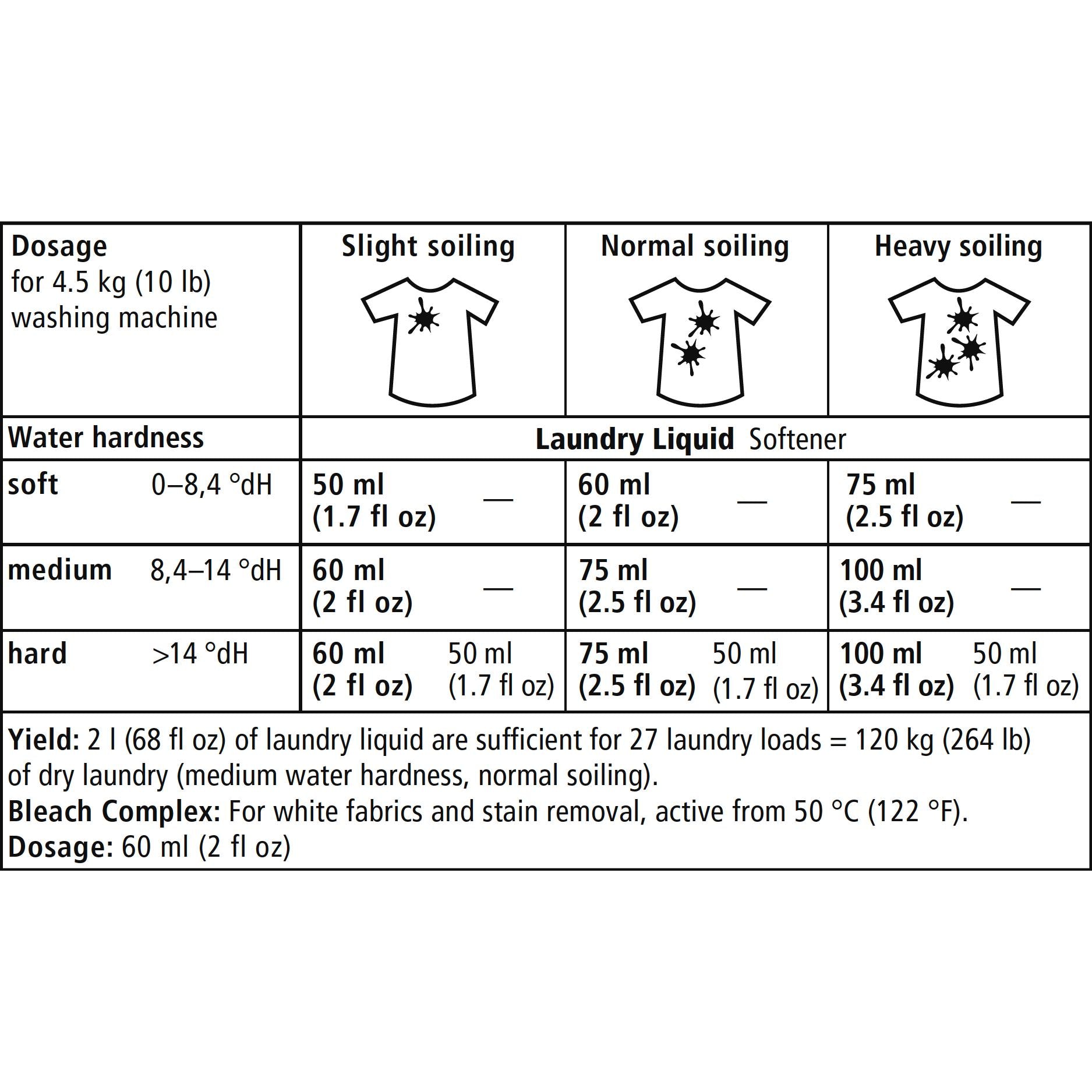 - Maschinenwäsche: Dosierung je nach Wasserhärte und Verschmutzungsgrad, normalerweise zwischen 30 und 60 ml pro Waschgang.