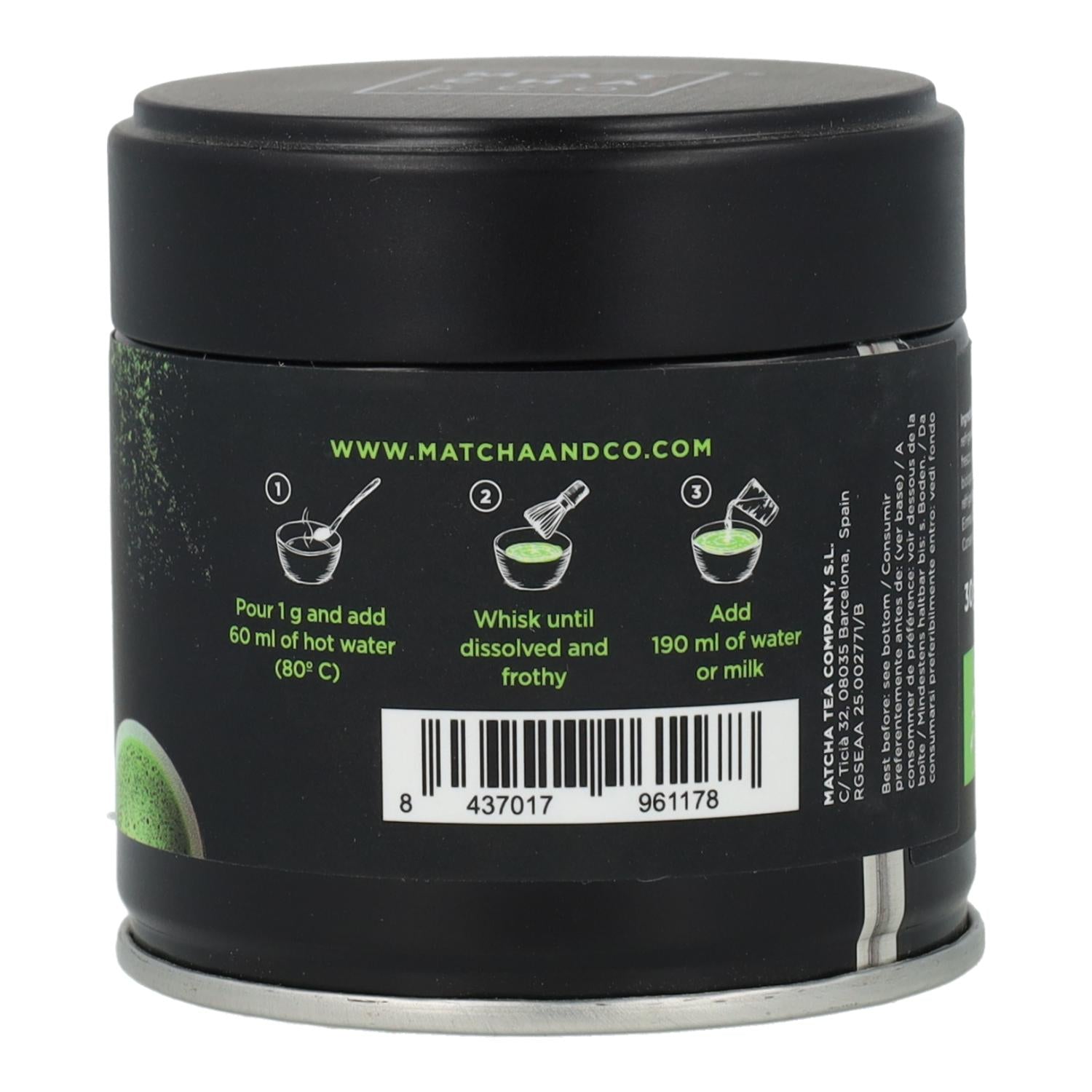 • Für einen traditionellen Matcha-Tee 190 ml Wasser, für einen Matcha Latte 190 ml Milch hinzufügen.
