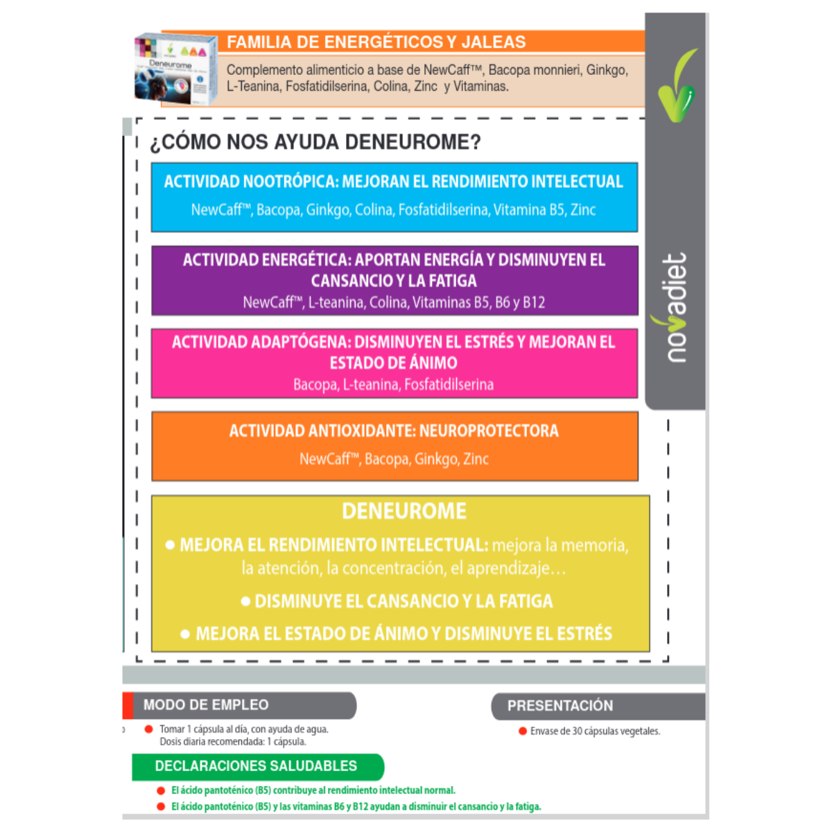Deneurome von Nova Diet ist ein Nootropikum zur Unterstützung der kognitiven und mentalen Leistungsfähigkeit. Es enthält eine Kombination aus Inhaltsstoffen wie Bacopa monnieri, Ginkgo biloba, L-Theanin, Cholin, Phosphatidylserin, Zink und B-Vitaminen sowie NewCaff™ (mikroverkapseltes Koffein). Diese Formel wurde entwickelt, um Gedächtnis, Aufmerksamkeit und Konzentration zu verbessern und geistige Erschöpfung zu reduzieren. Sie ist besonders hilfreich in Phasen hoher geistiger Belastung oder Stress.